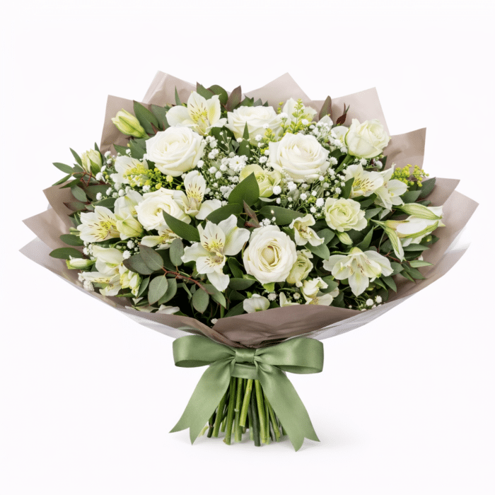 זר פרחים קלאסי ואלגנטי בגווני לבן וירוק רענן, המשלב ורדים לבנים, אלסטרומריה עדינה, ליזיאנטוס לבן ונגיעות גיבסנית וירק טבעי. השילוב בין הפרחים הלבנים והעלים הירוקים יוצר מראה נקי, יוקרתי ומלא רוגע.