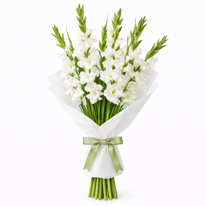 זר פרחים אלגנטי ומלא נוכחות המורכב מגלדיולות לבנות מרהיבות בעלות פריחה עשירה ומרקם עדין. הפרחים הגבוהים והמרשימים יוצרים מראה זקוף, נקי וחגיגי, כאשר כל גבעול פורח בהדרגה ומעניק לזר תחושה טבעית ורעננה. הזר נקשר בסרט ירוק עדין ומשלים מראה קלאסי, אלגנטי ומלא חן.