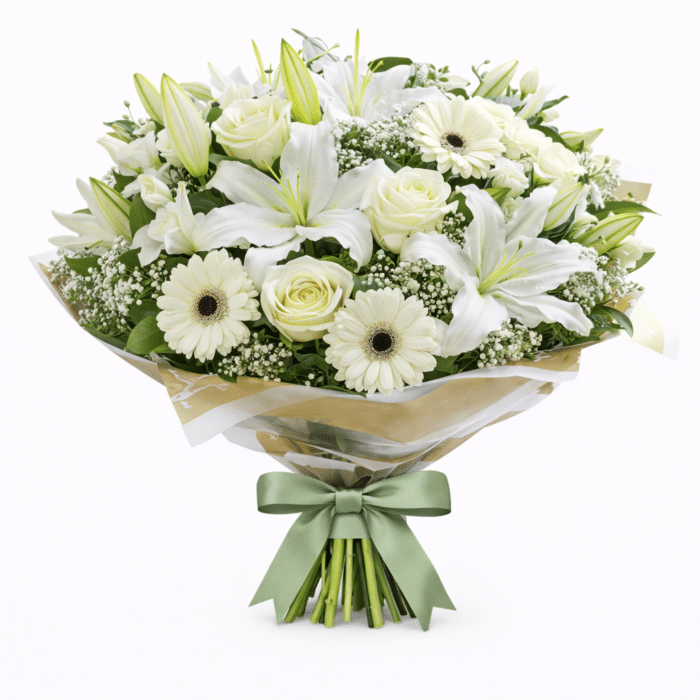 זר פרחים אלגנטי ומרשים בגוונים לבנים נקיים, המשלב חבצלות לבנות מרהיבות, ורדים לבנים, גרברות עדינות ונגיעות של גיבסנית וירק טבעי. השילוב ההרמוני יוצר מראה חגיגי, יוקרתי ורענן שמעניק תחושת טוהר ואלגנטיות קלאסית.