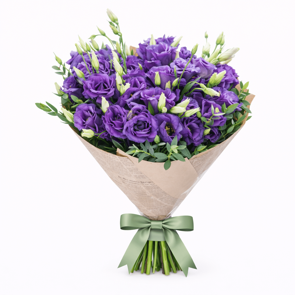 זר פרחים עשיר ומלא בליזיאנטוס סגול מרהיב, בשילוב ניצנים עדינים ונגיעות ירק טבעי שמדגישות את הצבע העמוק והאלגנטי של הפרחים. הסידור הצפוף וההרמוני יוצר מראה רענן, מלא חיים ומרשים במיוחד.