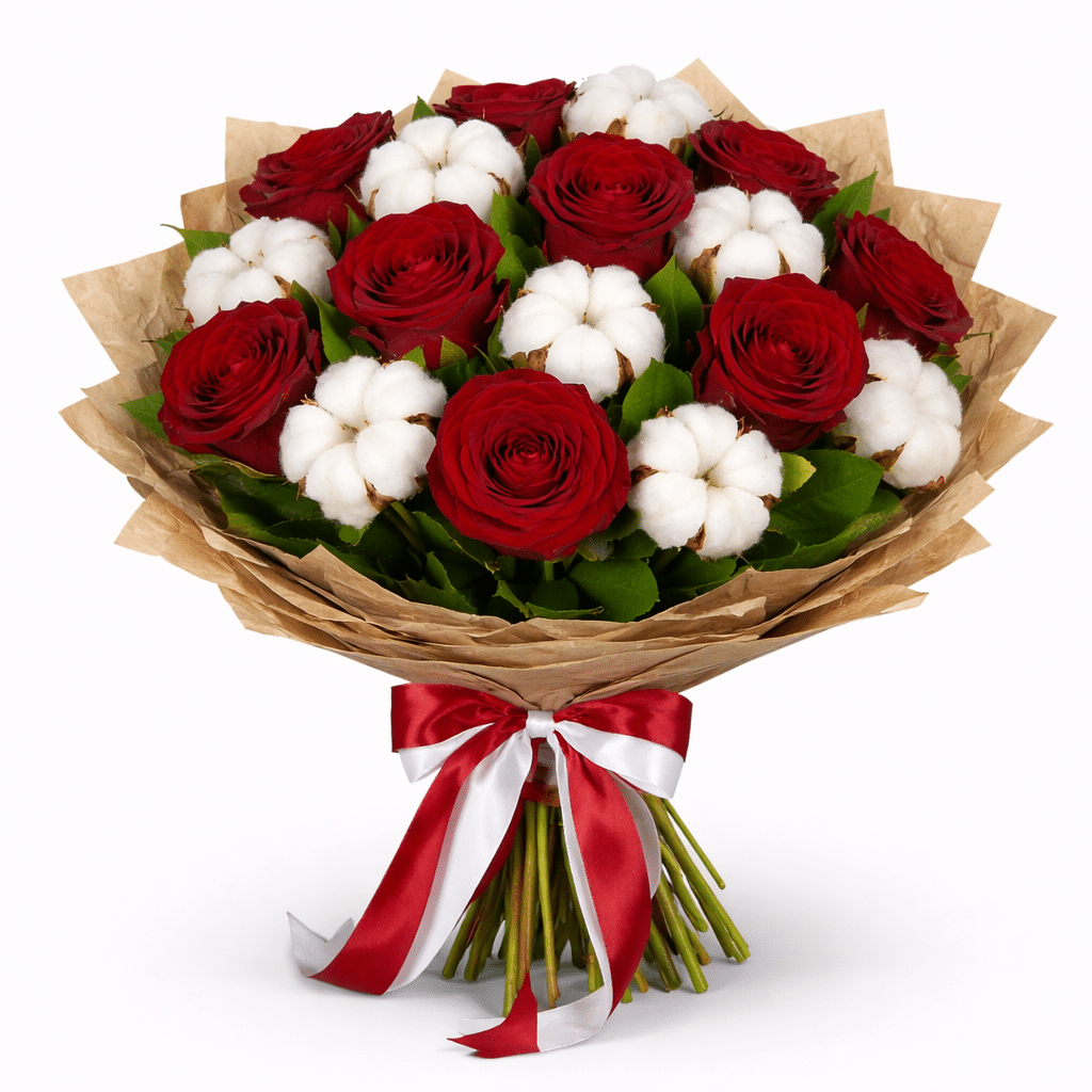 זר פרחים מרשים ועוצמתי המשלב ורדים אדומים עמוקים לצד פרחי כותנה לבנים ורכים, היוצרים ניגוד מרהיב בין תשוקה לרוך. שילוב הפרחים עם הירק העשיר מעניק לזר מראה מלא, דרמטי ומלא נוכחות שמושך את העין מיד.