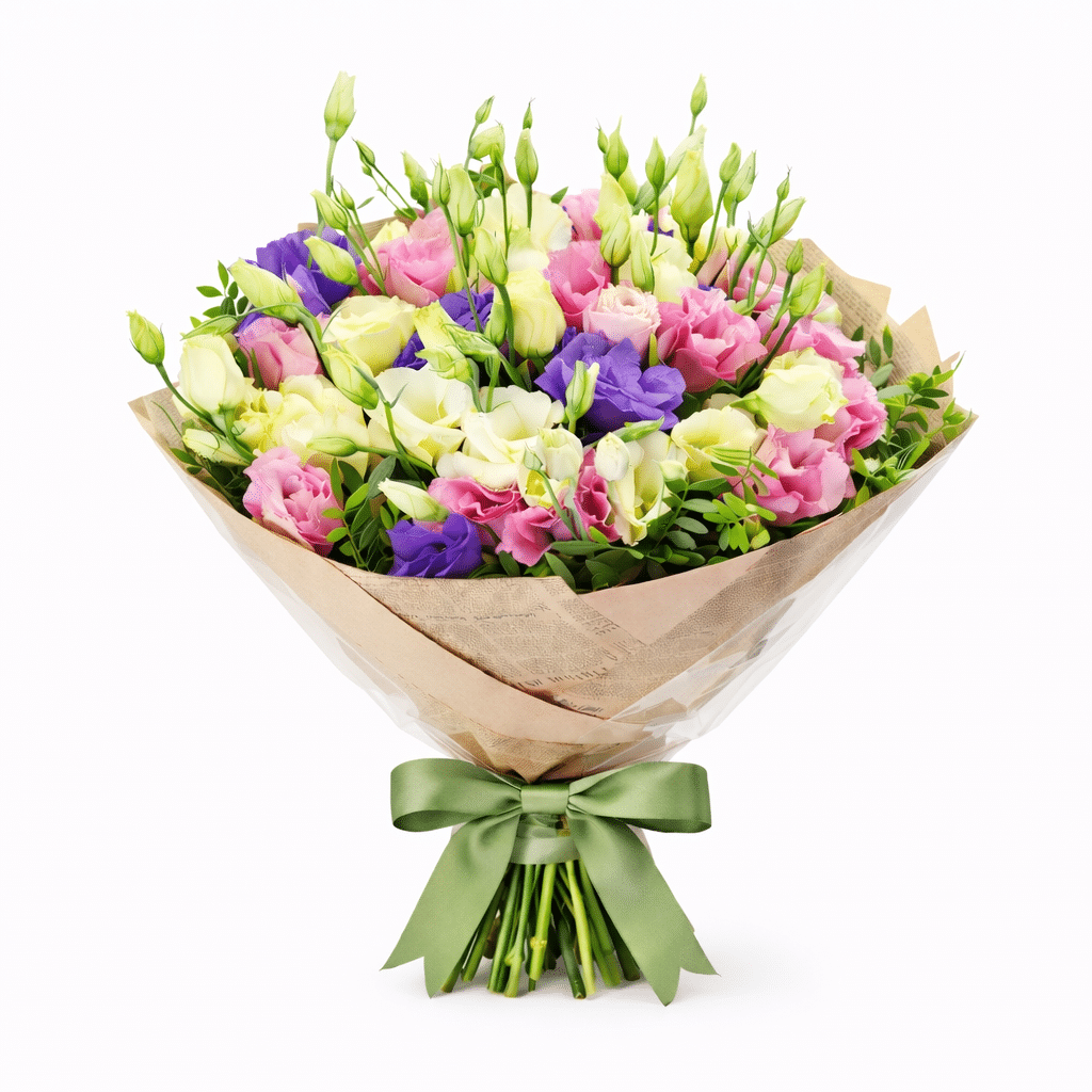 זר פרחים עדין ומלא קסם המשלב ליזיאנטוס בגווני ורוד, לבן וסגול, יחד עם ירק רענן ונגיעות פרחים משלימים היוצרים מראה רך, עשיר והרמוני. הזר מעוצב בקו טבעי ונעים לעין, עטוף בנייר פרחים אלגנטי ונקשר בסרט עדין להשלמת המראה.