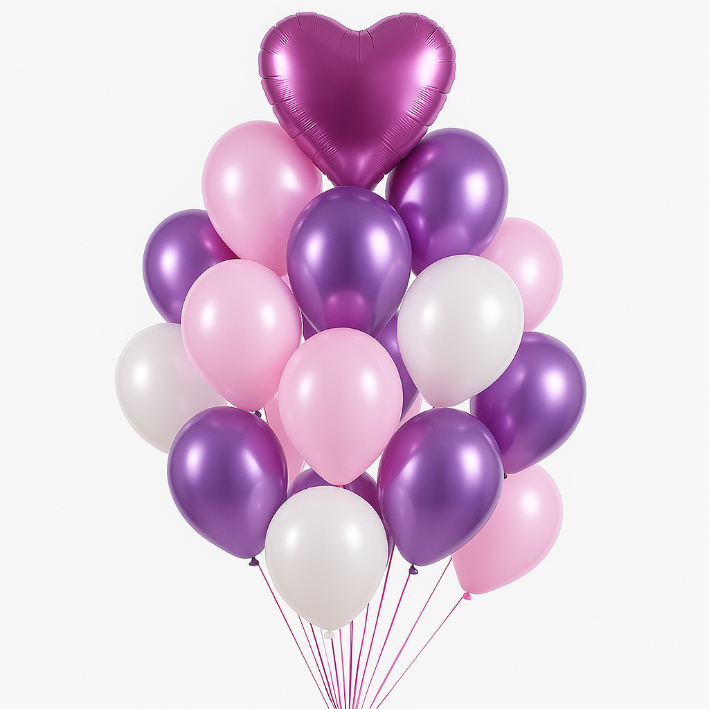 זר של 15 בלונים בגווני ורוד, סגול ולבן