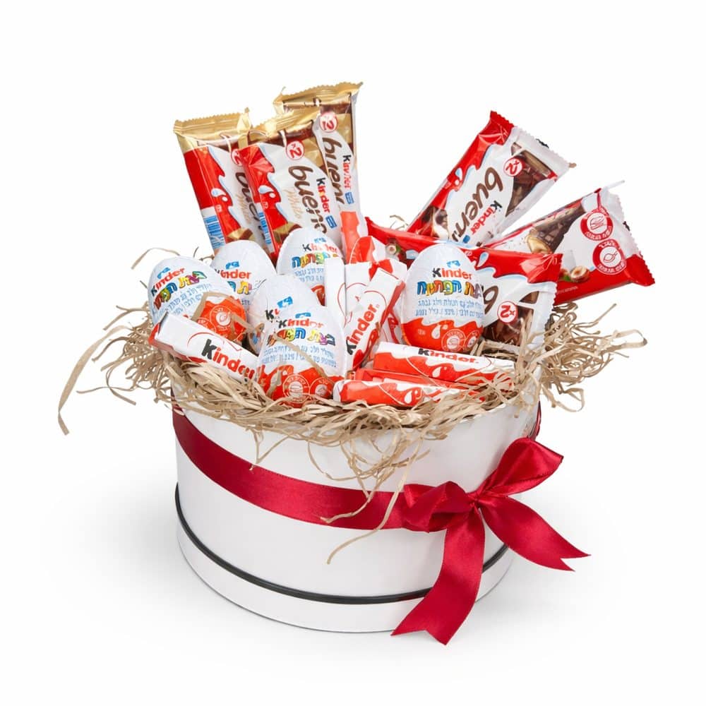 מארז שוקולד יוקרתי בעיצוב אלגנטי ומלא נוכחות, המשלב מגוון מוצרי קינדר אהובים בקופסת פרימיום לבנה עם סרט סאטן אדום. הסידור כולל 6 חטיפי קינדר בואנו, 6 ביצי קינדר וחבילה של אצבעות קינדר, המסודרים בקפידה ליצירת מראה עשיר, מוקפד וחגיגי. שילוב הצבעים האייקוני של קינדר יחד עם העיצוב הנקי והקלאסי מעניק למארז מראה מרשים ומתוק במיוחד.